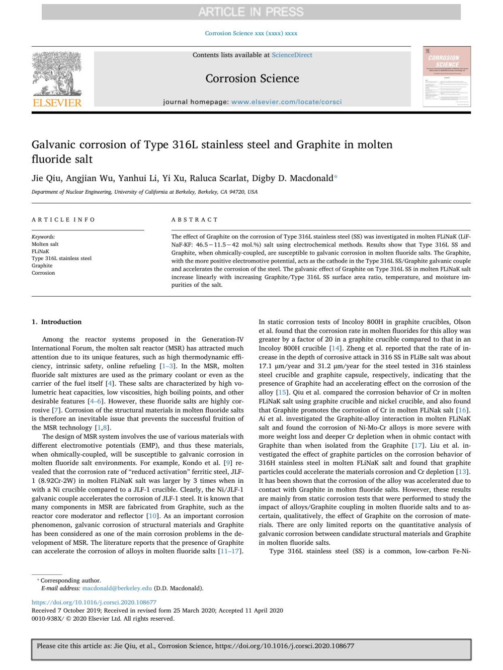 Galvanic corrosion of Type 316L stainless steel and Graphite in molten fluoride salt – Ebook PDF Instant Delivery – ISBN(s): 10.1016/j.corsci.2020.108677,10.1016/J.CORSCI.2020.108677